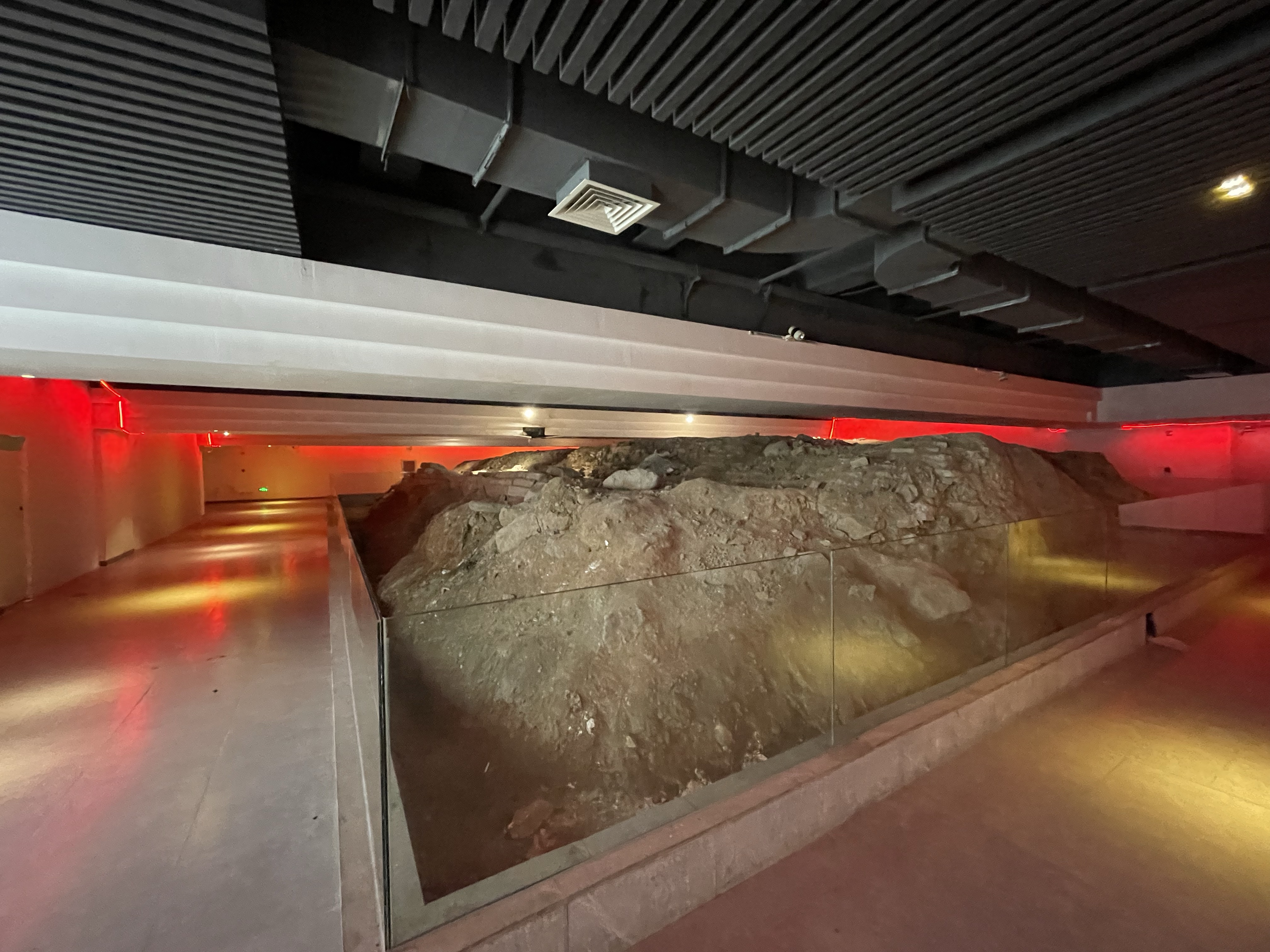 一推开门便是一股很重的潮味,天花板也很低,和以前去过的西安含光门、苏州相门的城墙博物馆完全不能比。没有展板介绍城墙的构成和年代,城墙上甚至还散落着一些当代建筑垃圾。十年前潮宗门挖出这一段120余米长的南宋、元、明累叠堆砌的老城墙,算是当年的一个大新闻,毕竟文夕大火没有给长沙留下什么文物了。后来建商强行拆毁了这段城墙,仅仅留下20米放在这个车库里供人凭吊,而且这个保存状况实在不能说有多好。