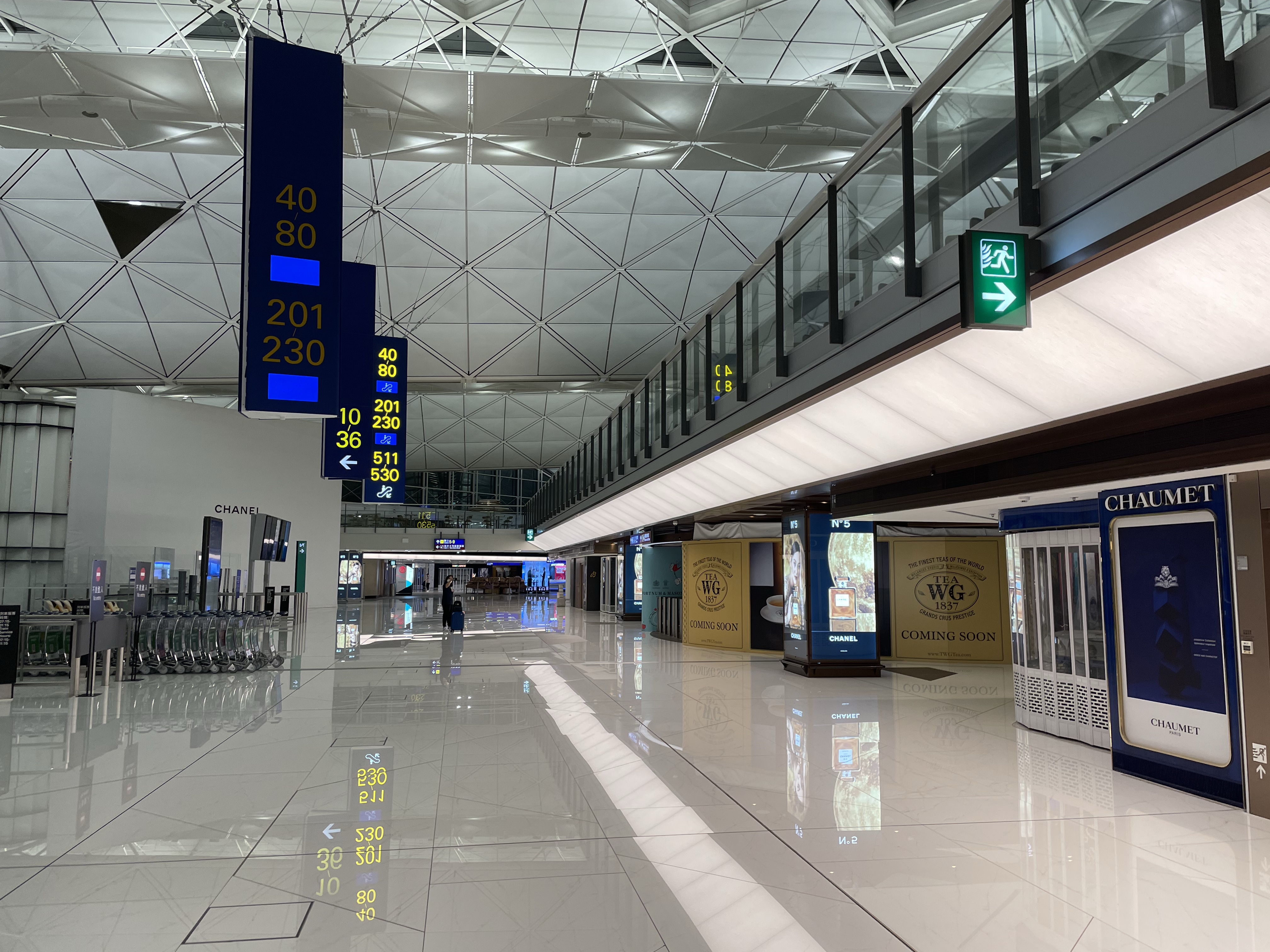 第二天我在香港机场,在转机禁区待了十几个小时。香港机场的硬件条件非常好,航站楼挑高明亮,座位干净整洁,办公桌插座齐全,很多登机口附近甚至还有躺椅。在机场办公一整天很舒服。不过偌大的机场可就是没几个人——以往香港机场每日入境十万人,现在每天只有十几班航班寥寥几千人。整个机场只开了一家万宁mannings、一家Relay经纬杂货店,一间"莆田"福建面馆,一间香港手信饼屋,一两间没什么人的免税店。百分之95的店铺都关闭着。我在机场的十几个小时,在禁区内看到的,坐着休息、吃饭的机场职员(入境处警察,航司职员)比旅客还多,也是一个奇观。